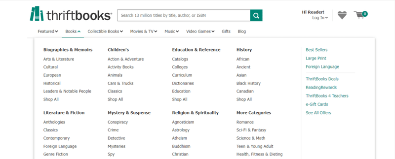 Need another platform where you can buy cheap books? ThriftBooks might interest you in that case. The website offers reduced prices on new and used books and guarantees quality to customers. Over 13 million titles are available on ThriftBooks and the platform also includes movies, music, and video games.